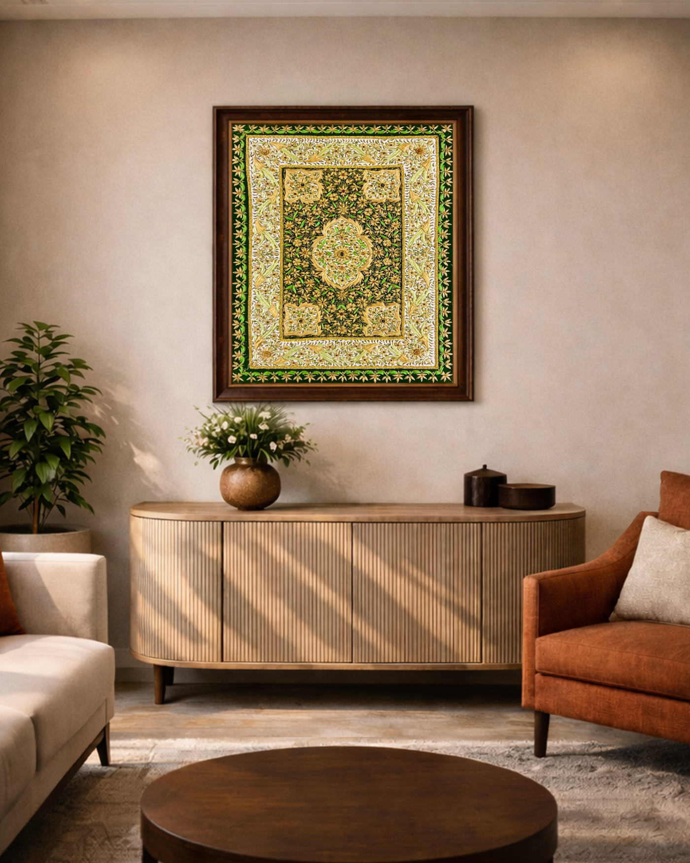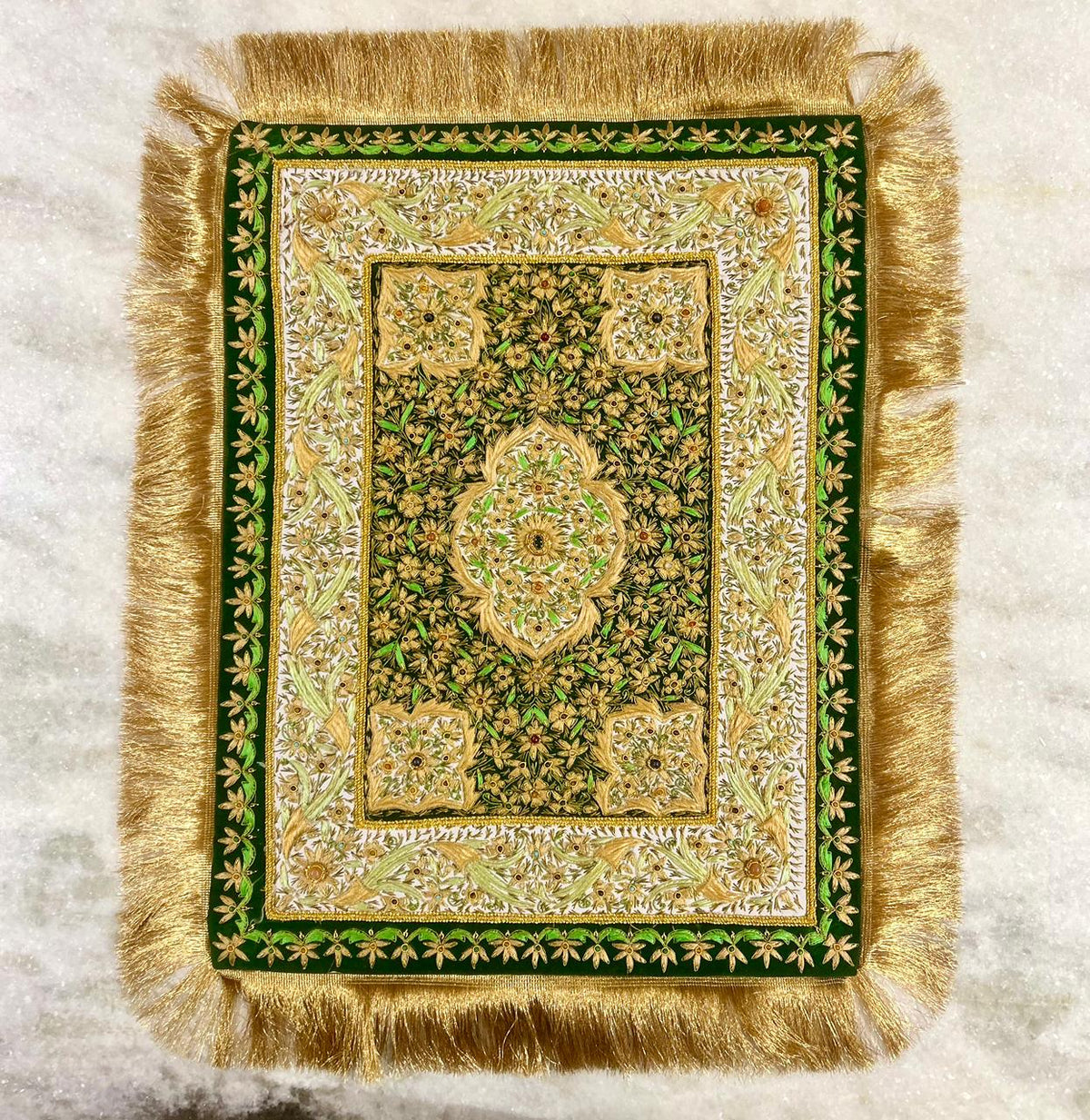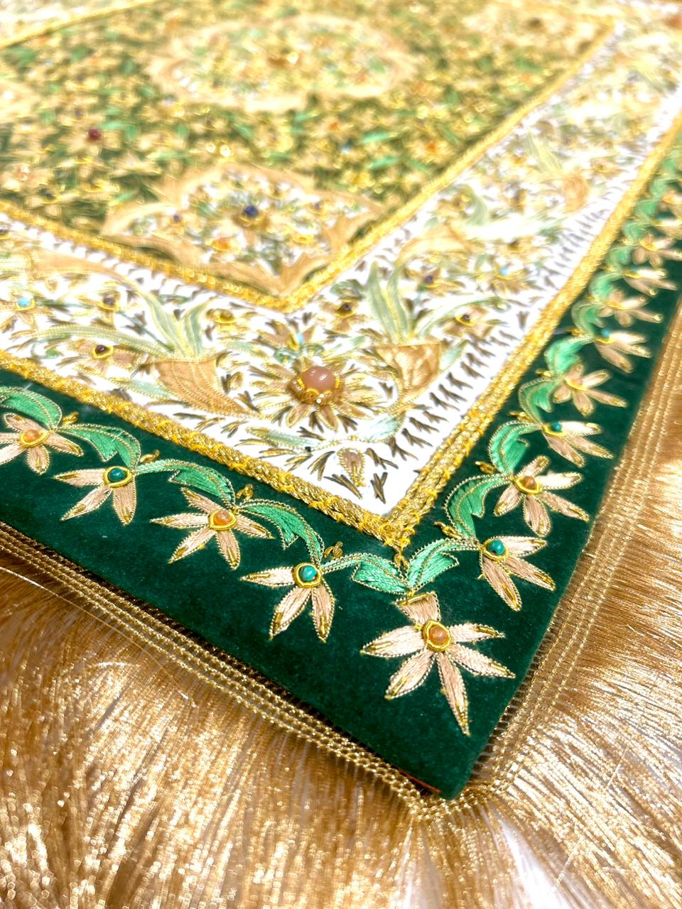 Each piece is a masterpiece of Zardozi embroidery, where Zari threads are skillfully woven to create a surface that shimmers like a jewel. The layered textures, opulent materials, and detailed craftsmanship give these carpets their distinctive “jewel-like” richness, transforming them into works of art rather than mere furnishings. Jewelled carpets are not just textiles—they are timeless narratives of Mughal elegance, heritage, and masterful artistry.