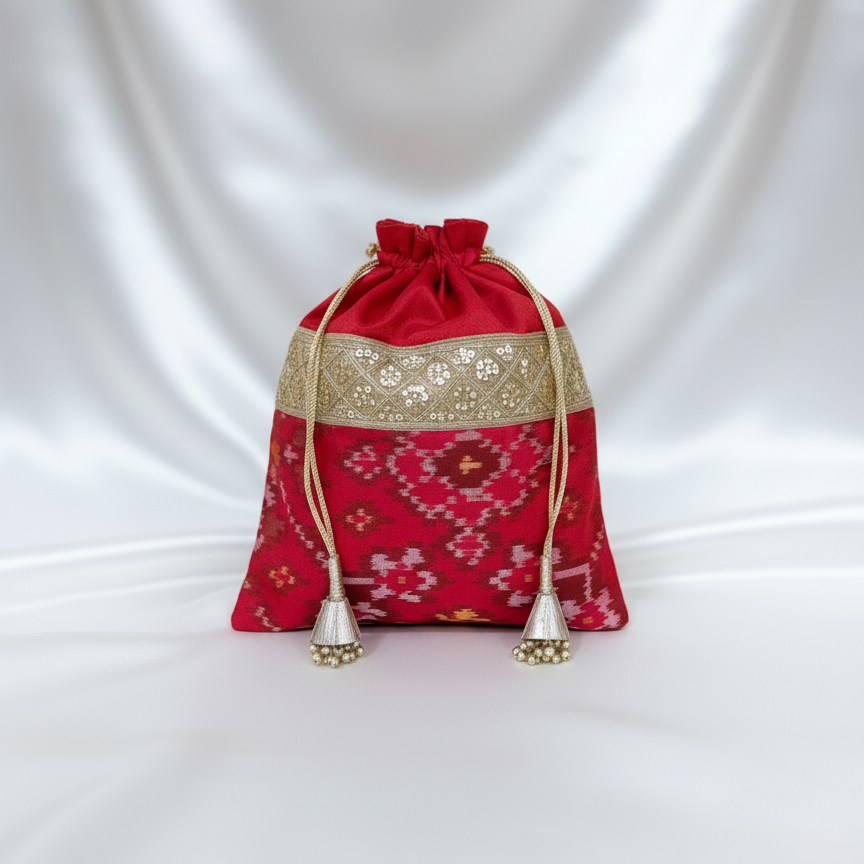 The Patoda fabric technique also called the Double Ikkat is a unique weaving technique of warp of weft threads that are wrapped to resist the dye according to the desired pattern of the final woven fabric making it possible to bring out the beautiful colours and patterns to life. A Gujarati proverb goes like – Padi Potade bhaat; faate pan fite nahi. It means that a pattern once woven into the Patoda fabric might tear but will never fade away and is etched for life. Thus, making it a symbol of eternity and never ending love.