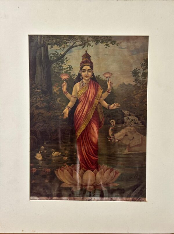 This exquisite vintage oleograph of Goddess Lakshmi, printed by the Ravi Varma Press, is a classic portrayal of the Hindu goddess of wealth and prosperity. Depicted standing gracefully on a blooming lotus, with elephants offering garlands and lotus flowers in each hand, this artwork symbolizes abundance, purity, and divine blessings. The detailing, soft color tones, and serene expression reflect Raja Ravi Varma’s mastery in blending mythological themes with naturalistic technique. This rare original print, restored with archival care, adds not just beauty but auspicious energy to any space.