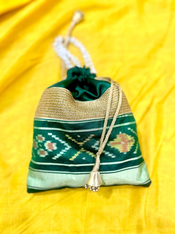 A Patola Batwa is a beautifully handcrafted Indian purse or pouch, traditionally made from the luxurious and intricate Patola silk fabric. Known for its vibrant colors, geometric patterns, and double ikat weaving technique, the Patola Batwa is a symbol of heritage and elegance. Each piece is a unique work of art, showcasing the skilled craftsmanship of Indian artisans. Perfect for special occasions, it adds a touch of traditional sophistication to any outfit, serving as both a functional accessory and a cultural statement piece.