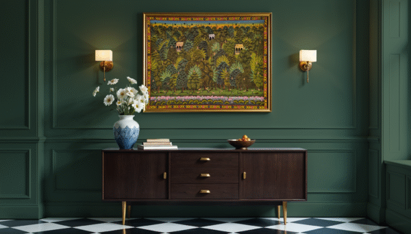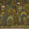 A captivating 5×3 feet Pichwai tableau of a divine forest in Vrindavan, hand-painted with meticulous detail and infused with natural hues and real gold foil accents — celebrating Krishna’s sacred connection with nature and all living beings.