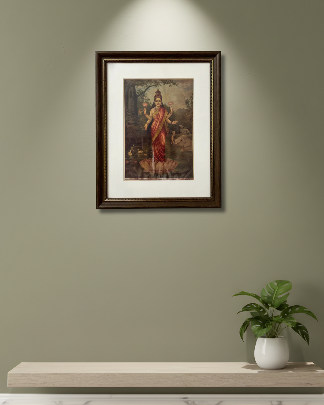 This vintage oleograph depicts Goddess Lakshmi standing on a lotus with elephants and lotus blossoms, symbolizing wealth, abundance, and divine blessings in serene detail.