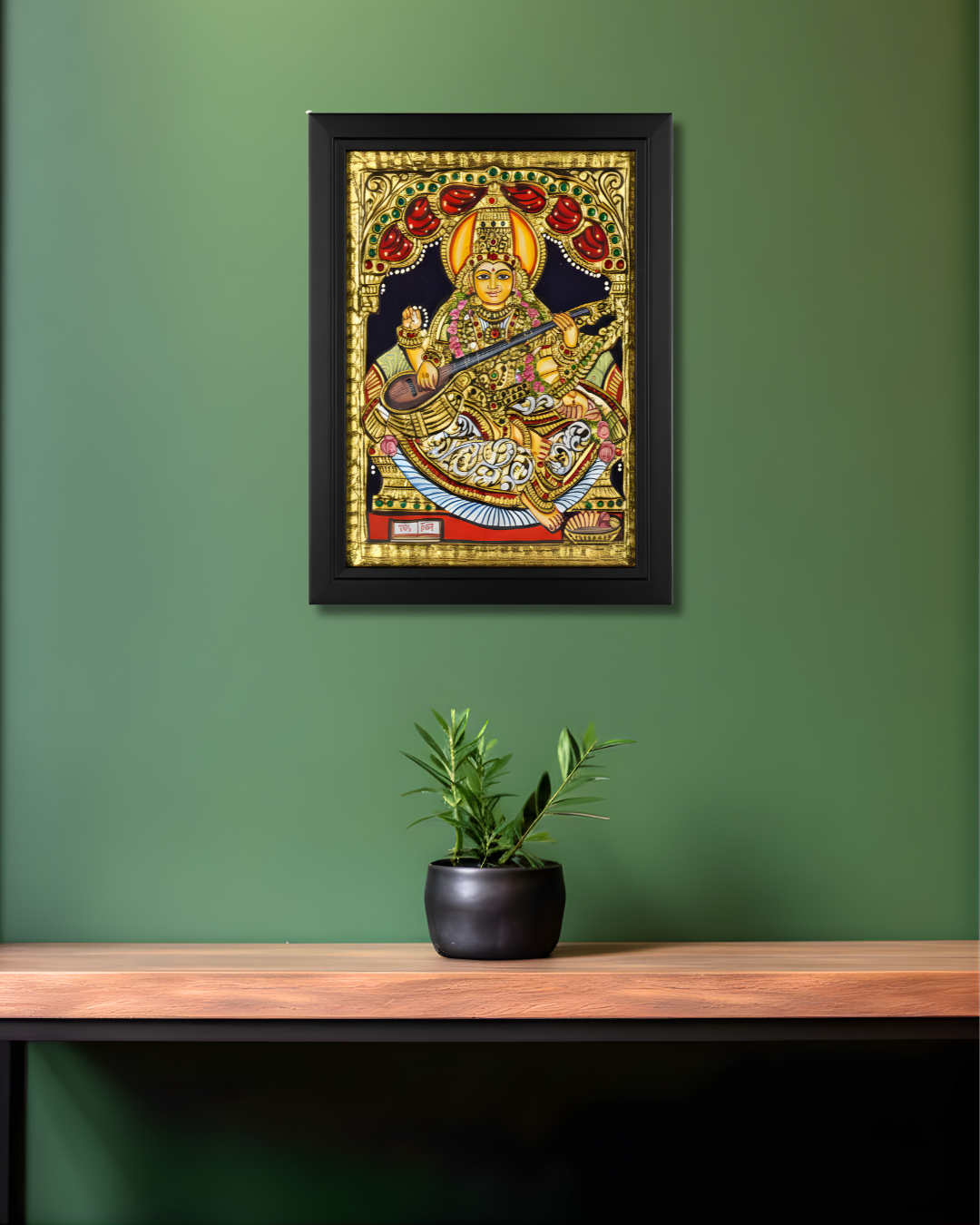 The Muse of Wisdom depicts Saraswati Mata on a lotus with her veena and swan, embodying intellect, purity, and serene inspiration in a traditional Tanjore style.