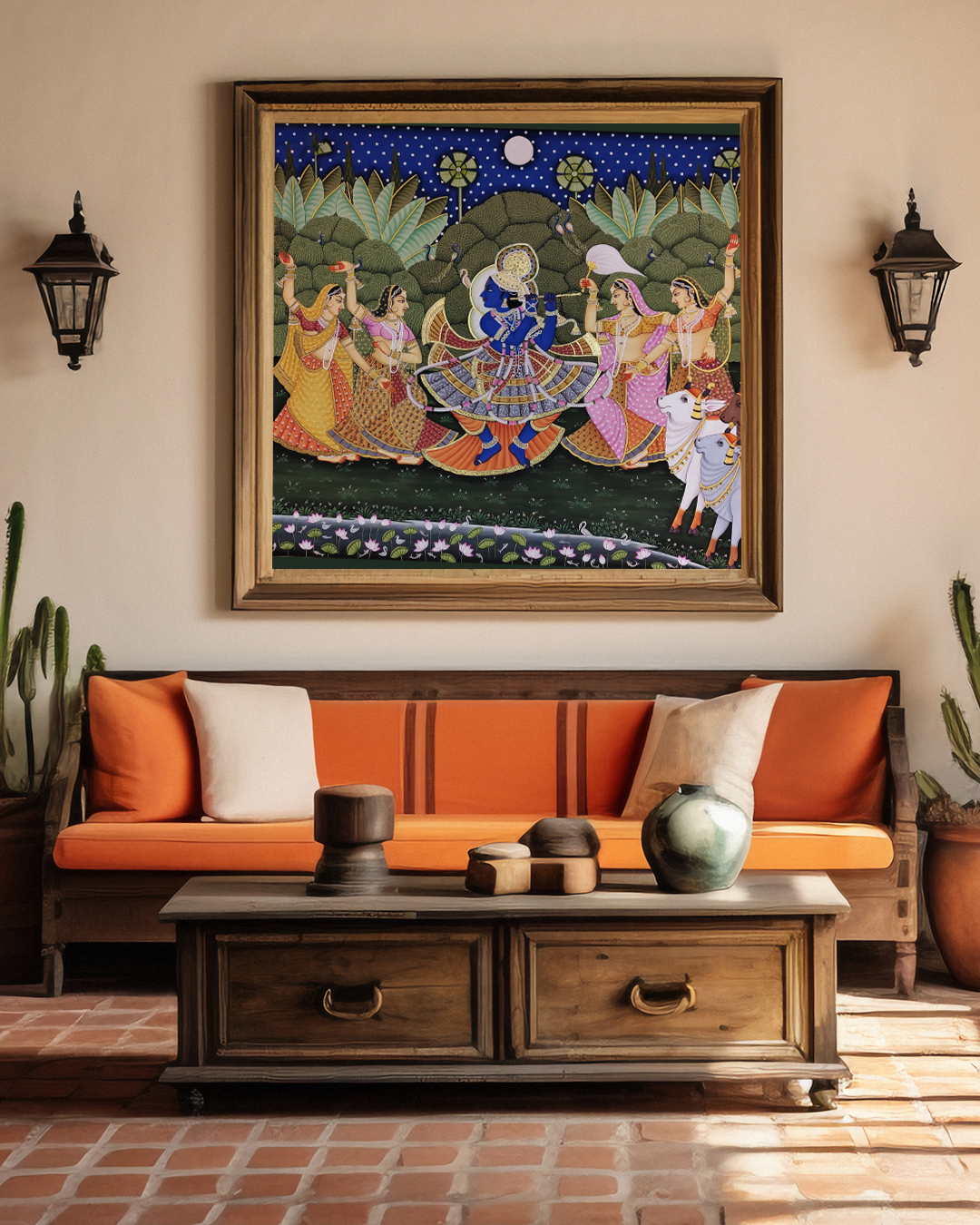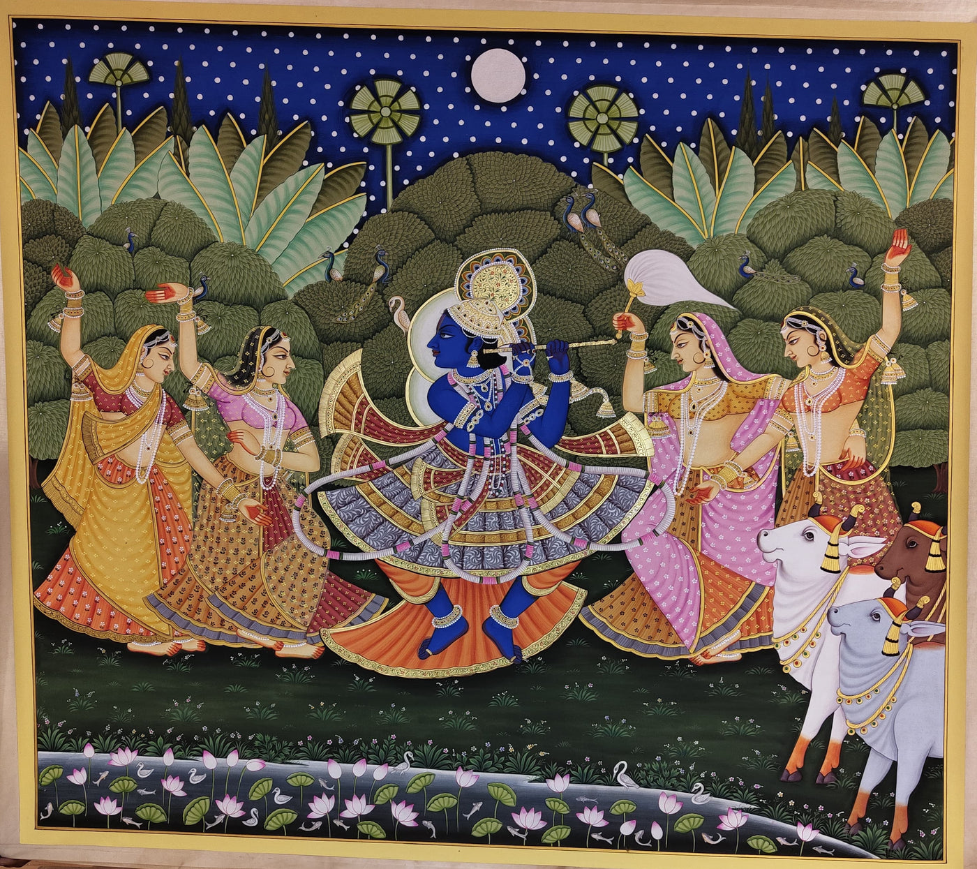 Raasraj depicts Krishna’s celestial Raas Leela, symbolizing divine love, bliss, and the eternal rhythm of devotion.