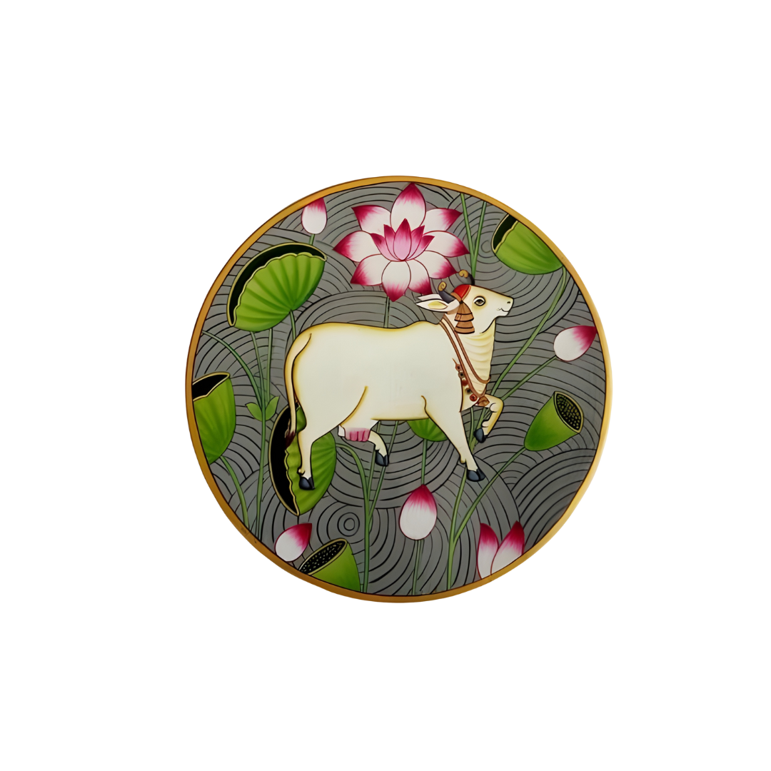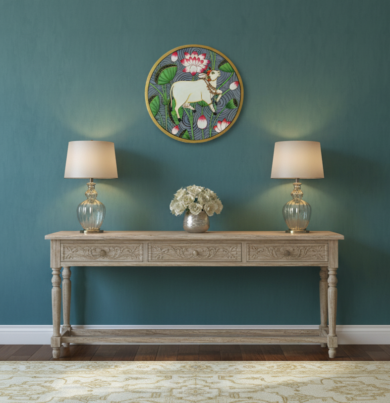 Pichwai art from Nathdwara, Rajasthan, beautifully portrays Lord Krishna, festive scenes, and nature in detailed, hand-painted designs that add cultural charm to any space.